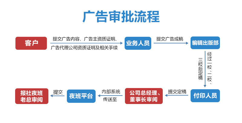 广告审批流程:客户提交广告内容、广告主资质证明、广告代理公司资质证明及相关手续至业务人员;业务人员提交广告成稿至编辑出版部,经过一、二、三校后定稿;付印人员提交定稿至公司总经理、董事长审阅;最后通过内部系统传至夜班平台,提交报社夜班老总审阅。