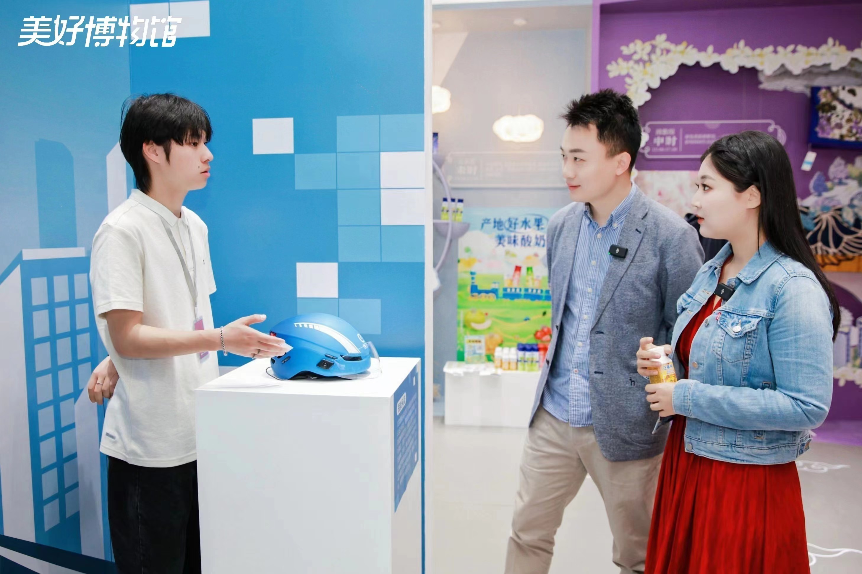 工作人员向观众介绍饿了么智能头盔。美好博物馆供图